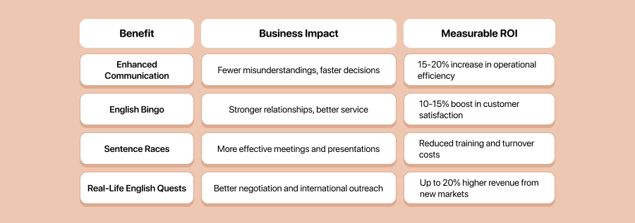 HR professionals need data-driven reasons to invest in language programs. Below is a table summarizing the benefits and measurable returns from implementing comprehensive business English training.