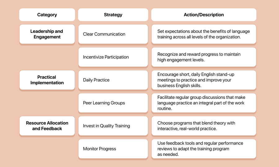 To ensure that your team gains comprehensive business communication skills, adopting a multifaceted approach is essential. Here’s how to effectively structure your language training programs:
