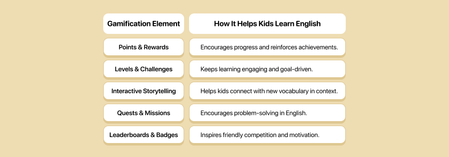 With these elements, gamified language learning makes mastering English feel like an exciting adventure, rather than a classroom chore.
