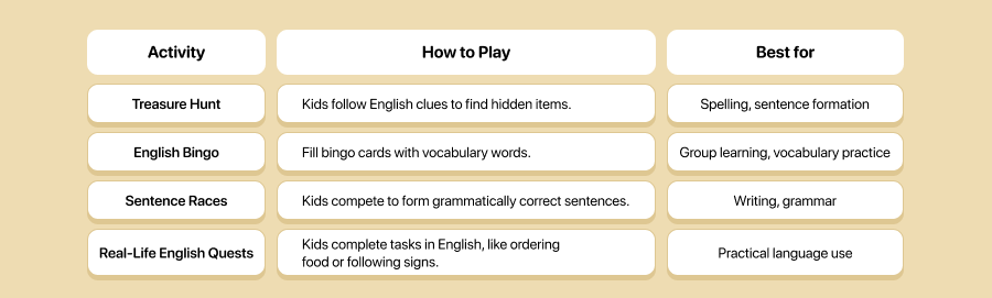 - 🎮 Virtual Reality (VR): Apps like Immerse allow kids to explore English-speaking environments.