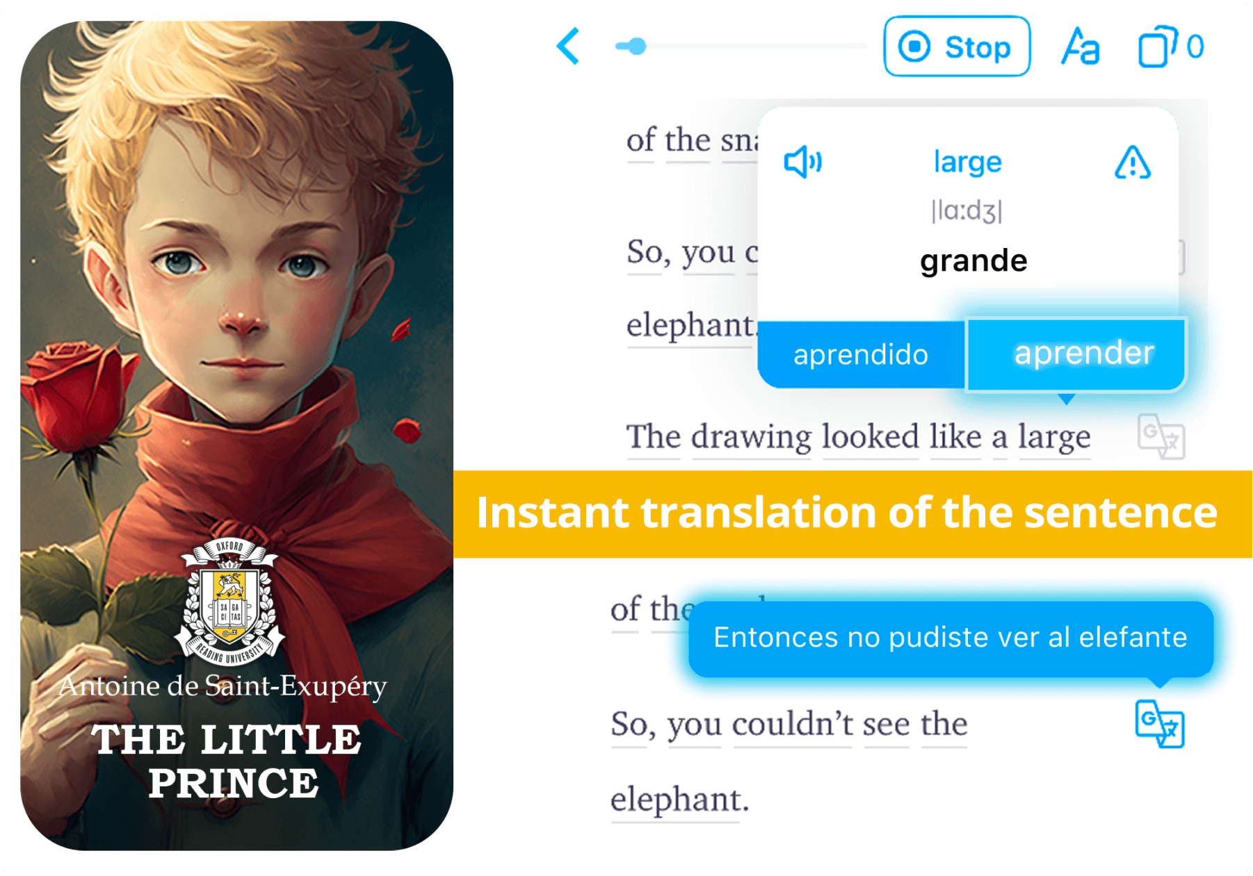 Start reading. When you come across unfamiliar words or phrases, EWA allows you to see translations by simply clicking on them.You also can see the translation of the whole sentence by tapping the icon on the right.This feature keeps you engaged in the story while helping you learn new vocabulary in context.