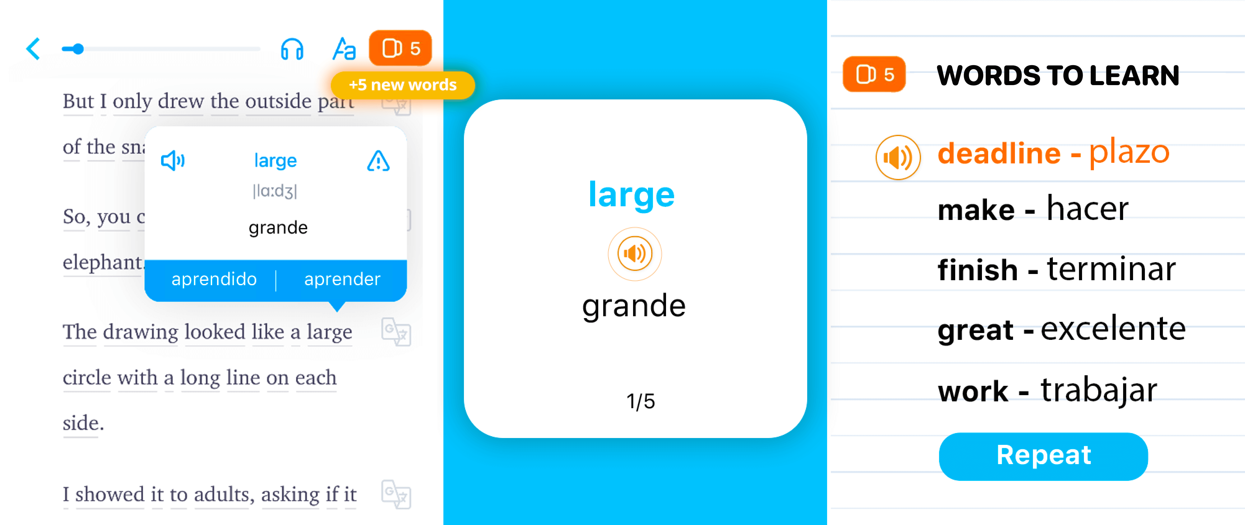 You can follow along with the text while listening to the correct pronunciation, as the text and audio are perfectly synced. The app even highlights where you’re reading so you stay on track. This combo helps with both understanding and speaking skills.