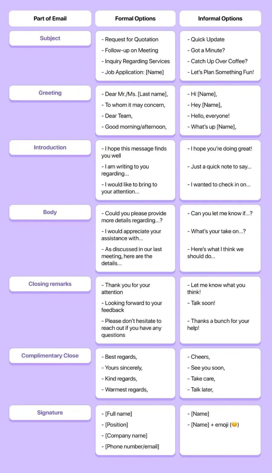 Here’s a table showing the typical email structure in English, with options for both formal and informal situations: