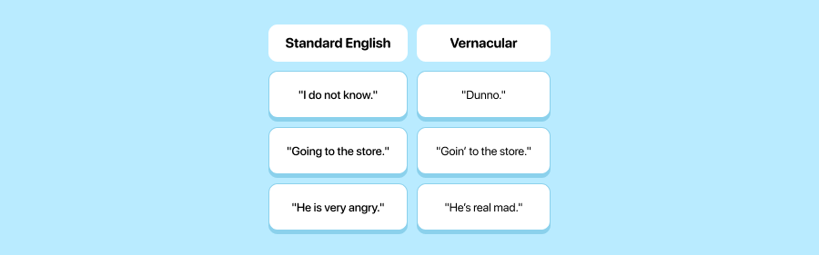 Now this is where things get spicy. Vernacular is the casual, informal, regionally flavored way that people actually speak in daily life.