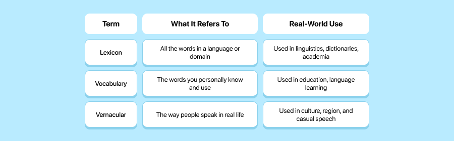 If you've ever wondered whether you're using the word "lexicon" correctly or if there's even a real difference between lexicon, vocabulary, and vernacular, you're not alone. These terms often get tossed around in conversations about language, but they’re not interchangeable.