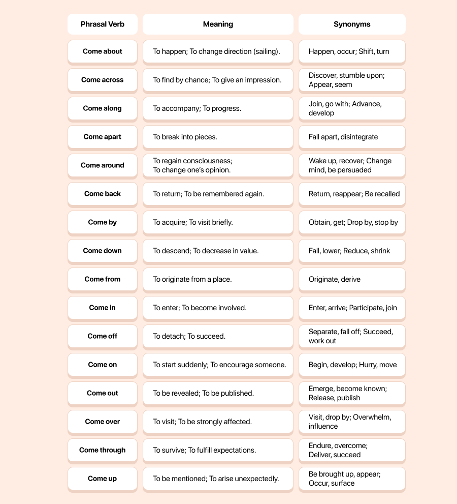 Before we dive into the details, here’s a quick reference table summarizing the meanings and synonyms for all 16 key phrasal verbs with "come".