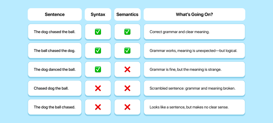 So next time you write something and it feels “off,” ask yourself: Does the sentence follow the rules? (Syntax) Does the sentence actually say what I want it to? (Semantics)