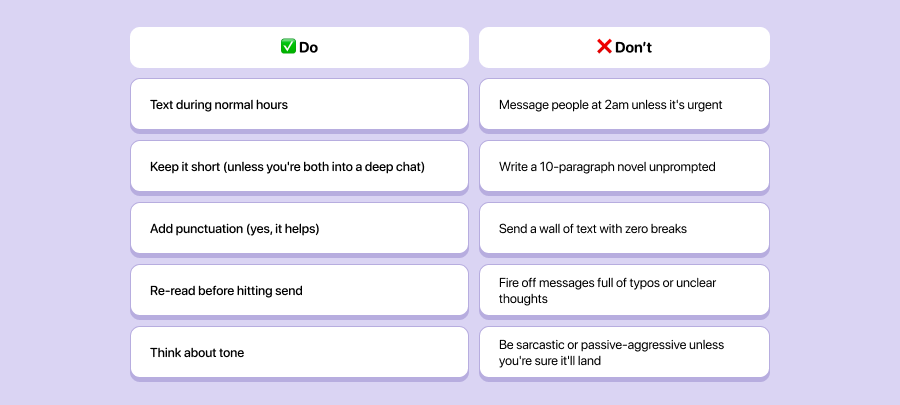 Respect people’s time, their attention, and their expectations. That’s the secret to good texting etiquette. And it’s how you avoid becoming that person — the one who texts too much, replies too little, or somehow always misses the mark.