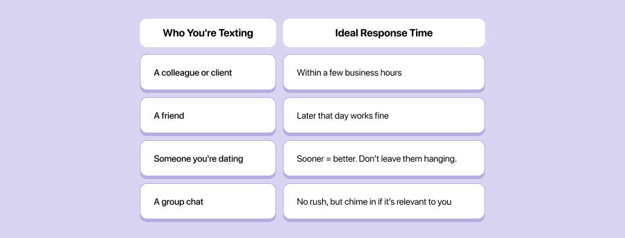 We all have lives. But if you leave someone on read for too long, they’ll start wondering what’s up. And it’s not just how fast you reply that matters — it’s also about choosing the right time of day to send your message. Here’s a quick guide to texting response time etiquette that keeps you looking attentive, not flaky.