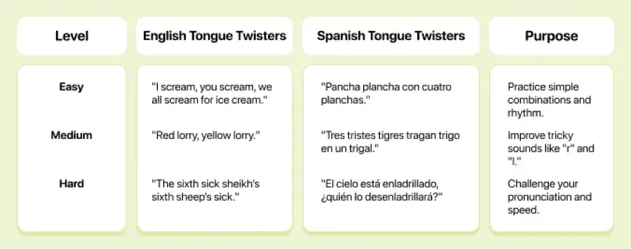 Tongue twisters aren’t just fun but also fantastic for improving pronunciation, speed, and speaking confidence. Whether you’re learning English or Spanish, adding tongue twisters to your daily practice will give your tongue a workout like never before. In this guide, you’ll find tongue twisters in English and Spanish for all levels.