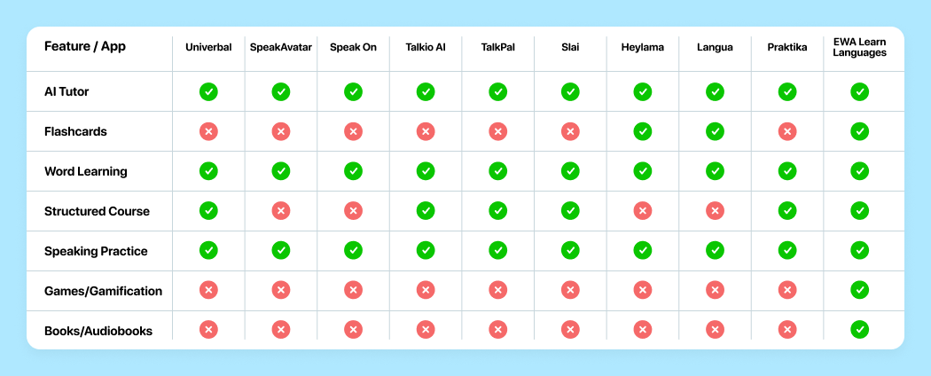 Below you’ll find a comparative table showing the main features of today’s most popular AI tutor apps. Most of them specialize in one area, like speaking or pronunciation, but a few, like EWA, combine AI tutoring with complete language courses, reading, and games for an all-in-one learning experience.