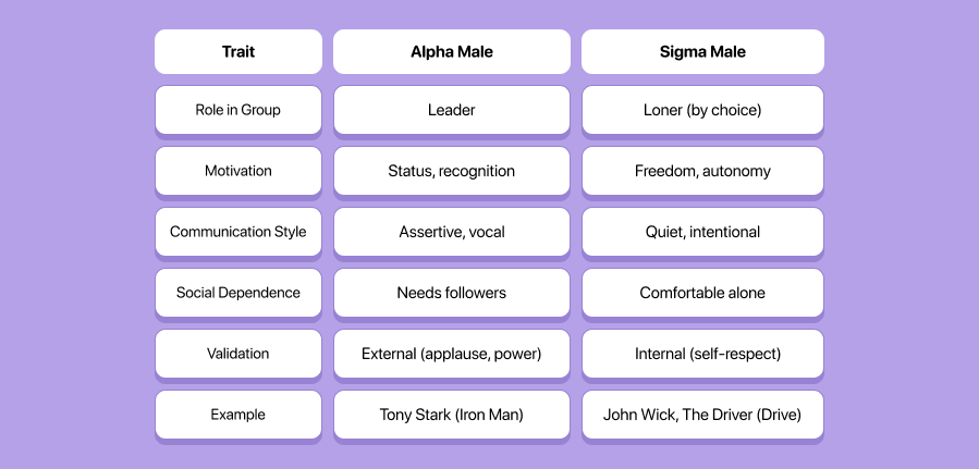 A sigma male is someone who lives outside traditional social hierarchies. Unlike the alpha (the loud, dominant leader) or the beta (the loyal follower), the sigma exists on his own path. He doesn’t need to dominate or be dominated. He just opts out of the game.