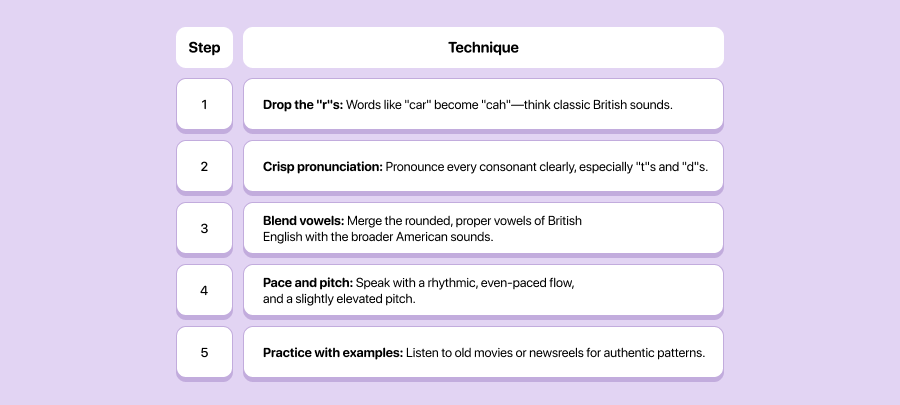 To speak with a transatlantic accent, start by dropping your "r" sounds (like British English), pronouncing consonants crisply, blending vowels from both American and British speech, and keeping a rhythmic, polished pace. Studying old films and practicing famous speeches aloud can help you master the style.