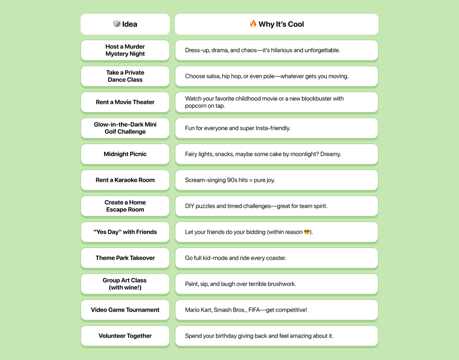 If your birthday is creeping up and you're thinking, "What am I actually gonna do this year?"—you're in the right place. You can choose a big celebration with your friends, keep it intimate with family, or fly solo; this mega-list of fun things to do on your birthday has you covered. Forget clichés — these are real, cool, and actually doable.